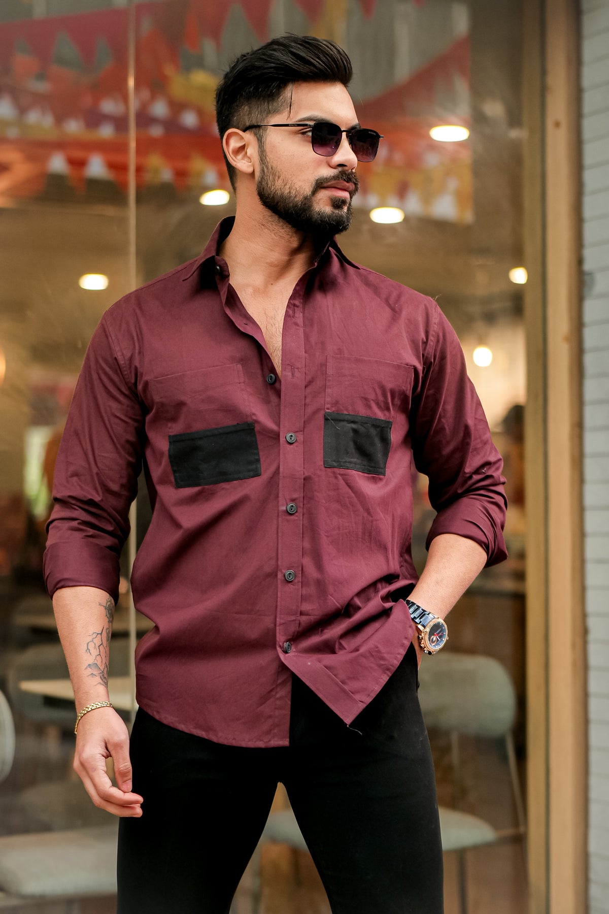 About The Product- Wine Double Pocket Cotton Designer Shirt , A Shirt That Is Stitched With Detailed Precision