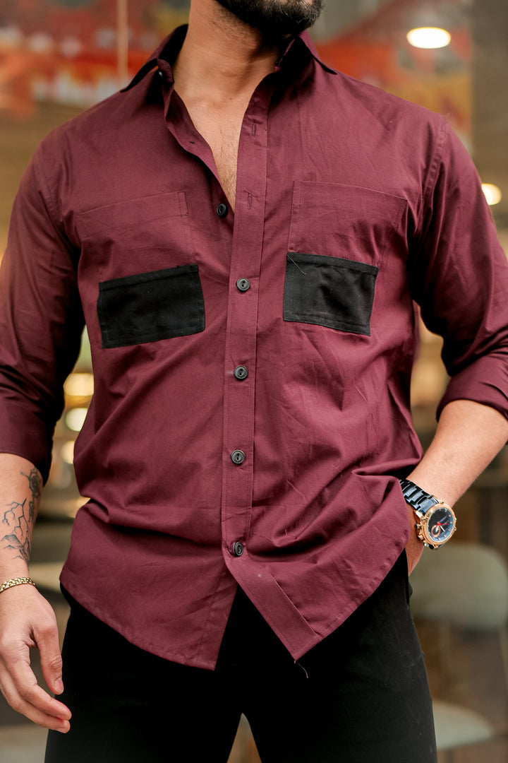 Wine Double Pocket Cotton Designer Shirt