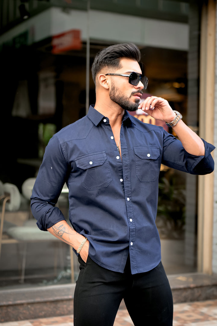 About The Product- Navy Plain Double Pocket Full Sleeve Shirt. A Shirt That Is Stitched With Detailed Precision